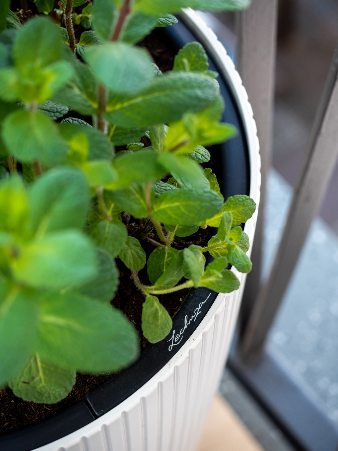 Ich erwähnte ja schon, dass für die Minze ein etwas größerer Topf zur Verfügung stehen darf. Der CILINDRO von Lechuza ist hier ein sehr passendes Modell. Nicht nur optisch kann er perfekt auf der Terrasse oder auf dem Balkon platziert werden, durch seine Bodenöffnung und sein Erd-Bewässerungssystem ist der von der Minze so geschätzte Wasserablauf gegeben. Über das wirklich große Wasserreservoir versorgen sich die Minze wie von selbst. Sollte die Pflanze zu üppig werden, kann man sie mit kleinen Rankgittern an den Seiten stützen.